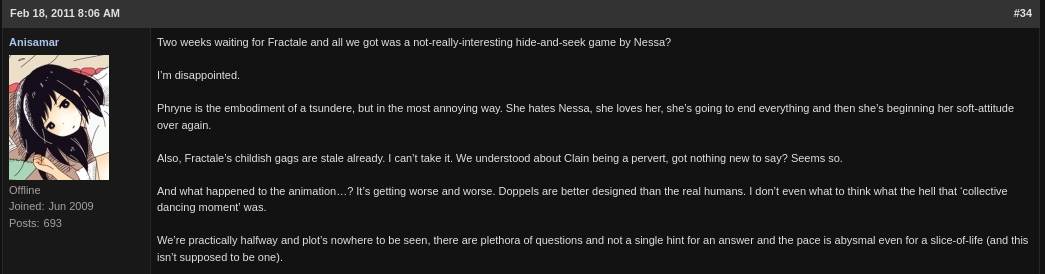 watching Fractale (another MC rec), didn't expect much going in off the reviews, but had to check out what people were saying on episode 5 and this pretty much matches what I've been thinking (minus the tsun girl hate, I don't mind her, it's just the whole structure and potential of the world being sorta wasted on a lackluster plot so far. Chobits did better than this one imo and they could've done so much more)